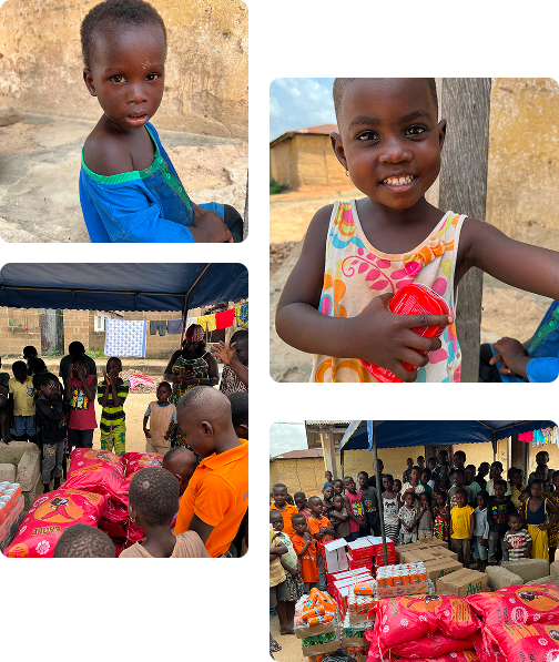Each image tells part of a larger story: generosity becoming organization, organization becoming outreach, and outreach becoming hope.